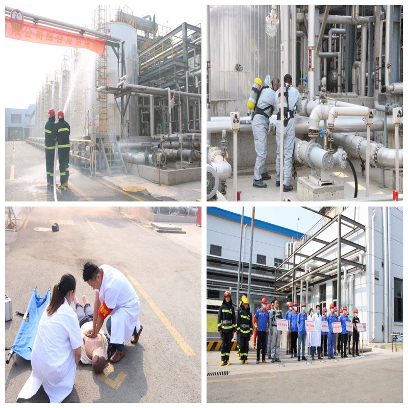 現場模擬二氯甲烷管道泄露,巡檢人員發現泄露后立即使用罐區應急器材實施堵漏。由于未正確佩戴防護用品,吸入二氯甲烷蒸氣后中毒倒地;值班人員迅速向消控室報告,公司立即啟動應急預案,成立現場指揮部;集結公司救援人員封鎖事故現場,疏散相關人員,進行緊急救援;堵漏過程中二氯甲烷蒸汽遇靜電起火請求外部支援,向消防隊、120報警,并指引消防隊、急救車趕到現場進行搶險救援。演練過程中,各小組分工明確,反應迅速,集結有序,配合緊密,演練內容科學合理,各小組之間協同密切,充分發揮了團結互助的團隊精神,為公司應對突發事件積累了實戰經驗。滕州市消防大隊龍泉中隊6名官兵出動消防車參與了此次演練。